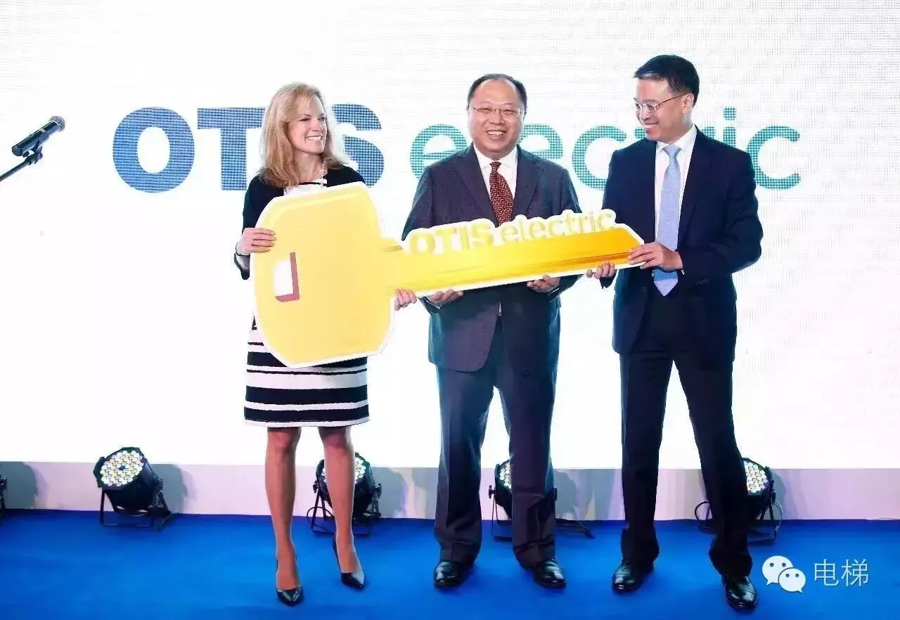 奥的斯全球新梯营销及战略规划副总裁Robin Fiala(左一)、奥的斯中国区总裁郑培明(右一),共同将象征开启品牌发展的金钥匙交给奥的斯机电总裁朱康正(中间)