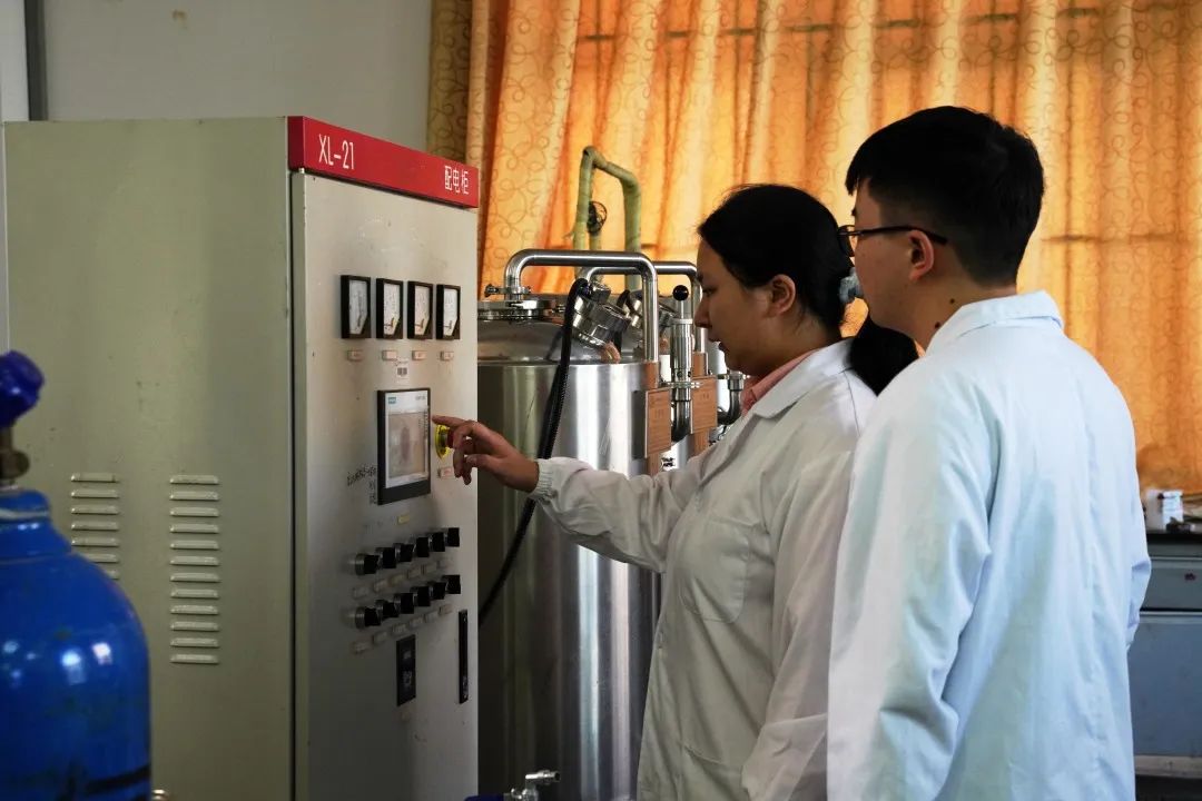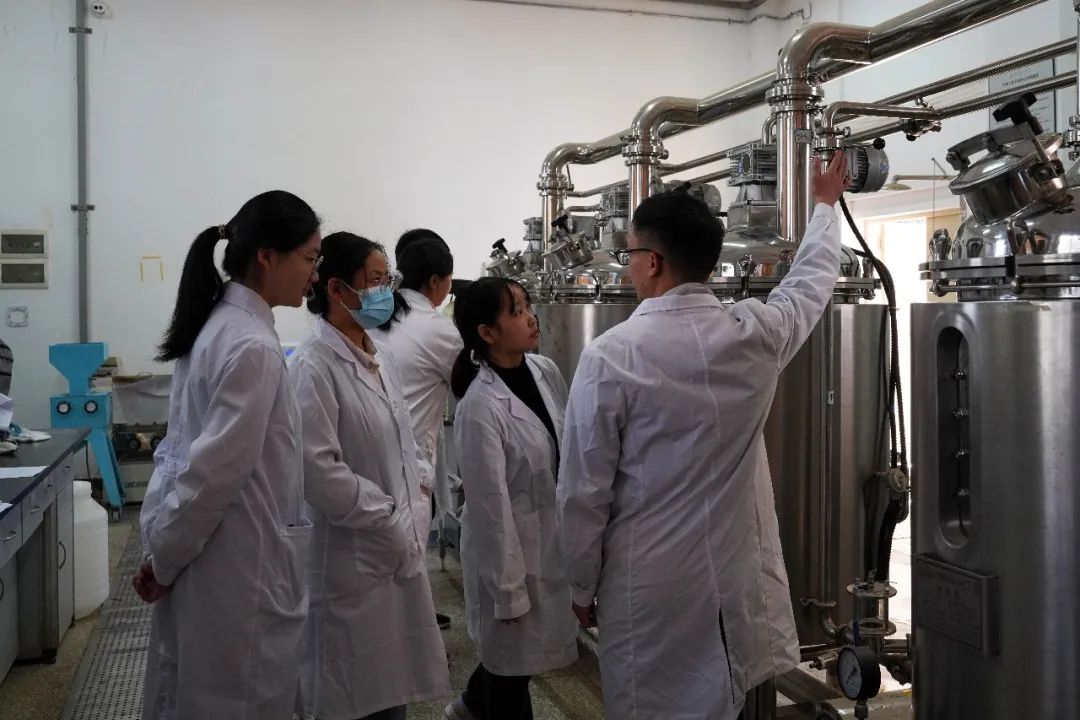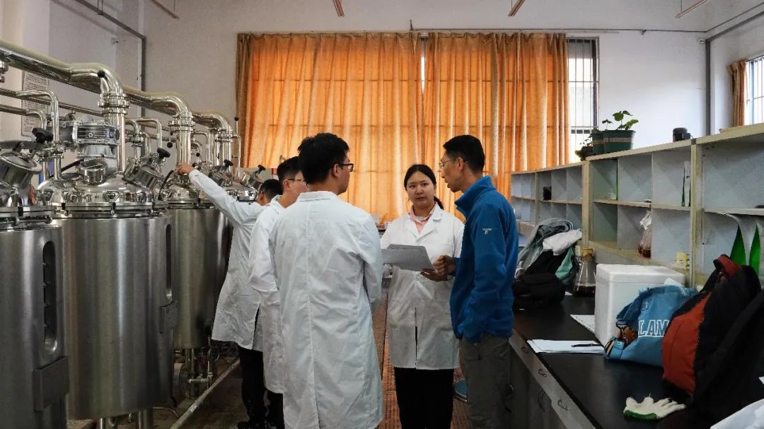 觅着浓厚的酒香,踏入微生物发酵实验室,硕大的瓶瓶罐罐映入眼帘,管道交错穿插其间,同学们正围着器材专注实验。
