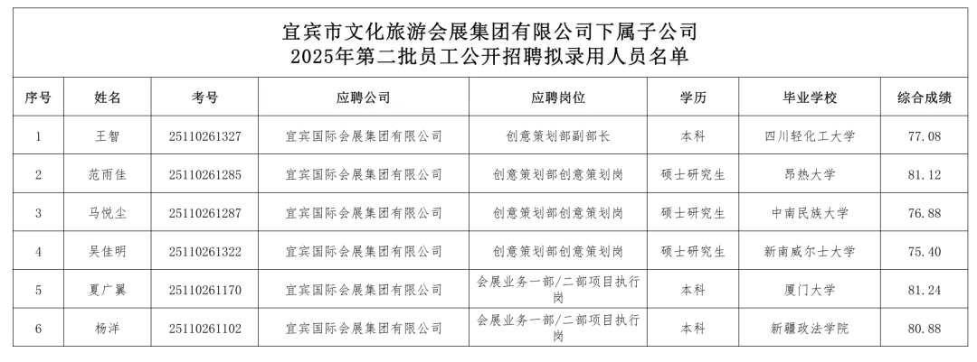 宜宾市文化旅游会展集团有限公司下属子公司2025年第二批员工公开招聘拟录用人员名单公示宜宾市文化旅游会展集团有限公司下属子公司2025年第二批员工公开招聘拟录用人员名单公示