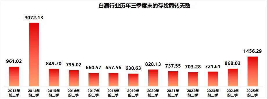 经销商面临着较大的囤货压力,白酒产业陷入库存危机,这一点从上市20家酒企的平均存货周转天数可见一斑。三季度末,该指标攀升至1456.29天,相较于2024年同期的868.03天激增超60%,且创下2015年以来的新高。