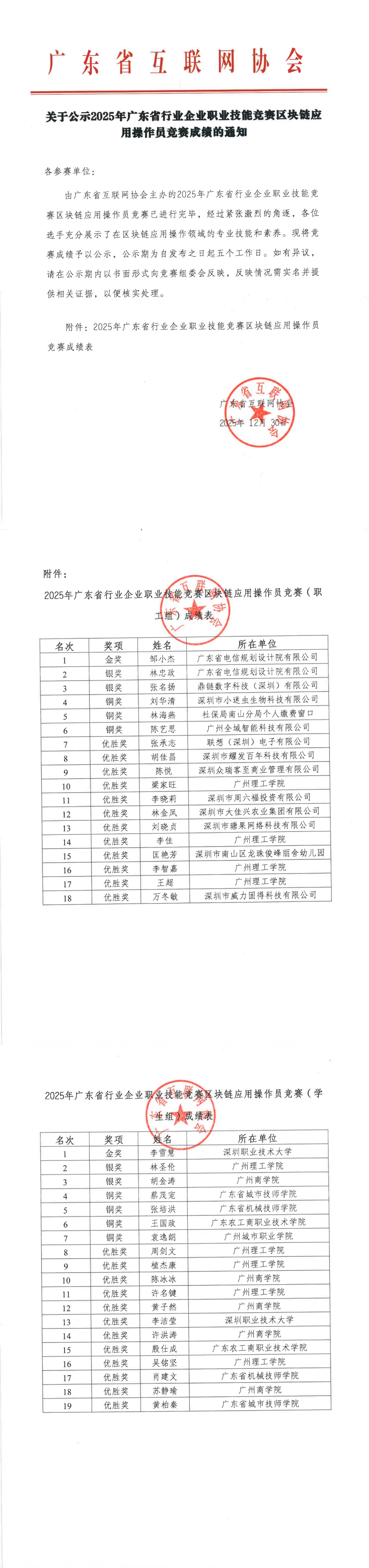 关于公示2025年广东省行业企业职业技能竞赛区块链应用操作员竞赛成绩的通知