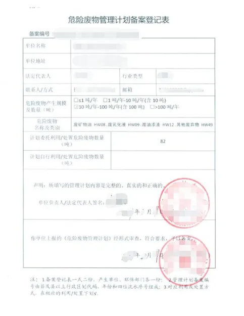 危险废物管理计划备案登记表