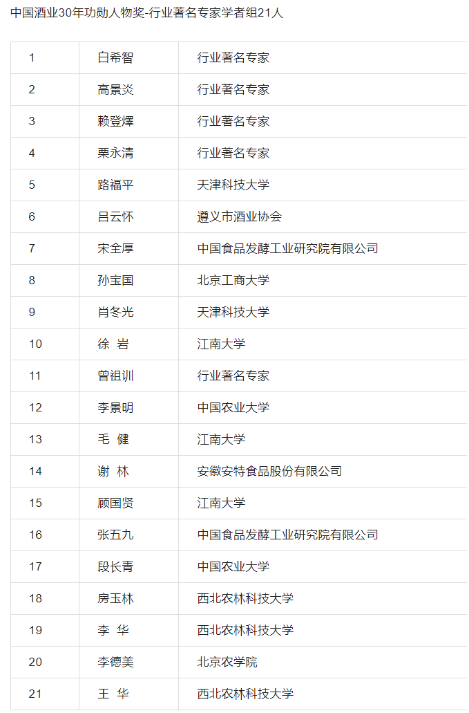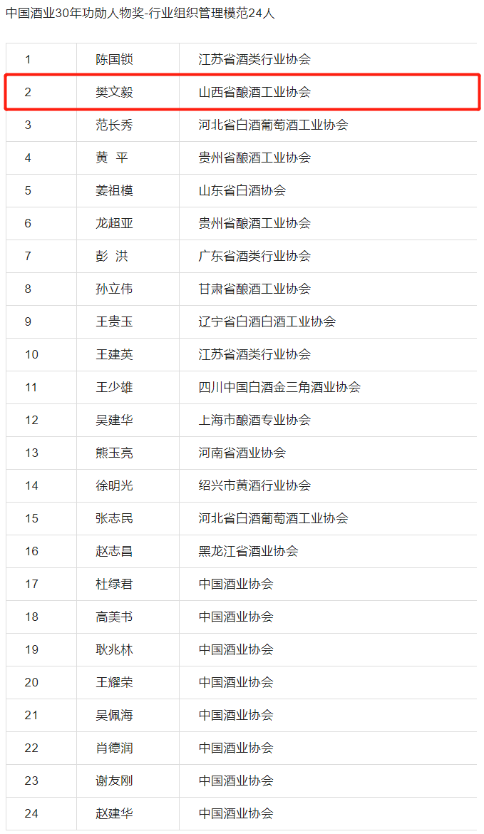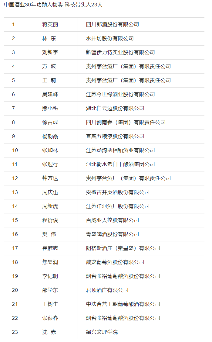 在3月26日举行的“再出发,责任重于泰山——中国酒业协会成立三十周年庆典”上,对扎根酒业一线、赓续酒业传承的酒业模范授予了“中国酒业30年功勋人物奖”荣誉称号。21位行业著名专家学者、63位行业突出贡献领导人、23位科技带头人、24位行业组织管理模范获此殊荣。