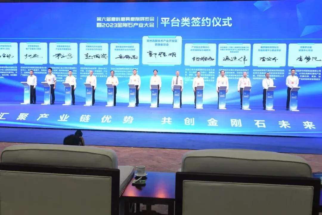 大会得到了工信部工业文化发展中心,省科技厅、省工信厅、省科学院、省科协,九三学社河南省委,郑州大学、中国地质大学(北京)等指导支持;发布了《中国金刚石产业发展地图2023》《郑州高新区振兴超硬材料产业若干措施》;现场签约项目36个,签约额197亿元;举行了金刚石产业高质量发展企业家对话圆桌论坛。中国工程院院士何季麟、傅正义、谭建荣,中国科学院院士张卫红,中国地质大学(北京)党委常委、副校长武雄等院士专家,来自英国、德国等国际嘉宾,及400余名重点企业代表参加大会。省科技厅党组成员、副厅长陈志强,省工信厅党组成员、副厅长李翔,省科协党组成员、副主席王继芬,省科学院副院长李兵,九三学社河南省委二级巡视员王清彬,市领导虎强、马志峰、李秋红参加。