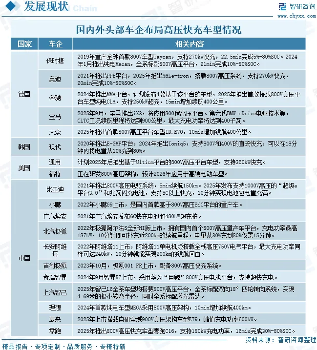 高压快充架构凭借其充电速度快、能量效率高的显著优势,正成为提升新能源汽车产品竞争力的重要手段,并逐渐发展为车型差异化卖点。自2019年保时捷推出全球首款800V高压平台车型Taycan以来,全球主流车企纷纷加速高压快充车型的布局。在海外市场,保时捷、奥迪、奔驰、宝马、大众、现代等品牌已陆续推出量产车型,通用、福特等企业也计划在未来两年内推出相应产品。中国市场中,比亚迪、小鹏、广汽埃安等车企较早投入高压快充技术研发,已在快充领域建立起领先优势;与此同时,极狐、阿维塔、极氪、智界、智己等新兴品牌则通过产业链合作与技术整合,积极提升其在高压快充赛道上的竞争能力,共同推动高压快充技术的规模化应用与持续演进。