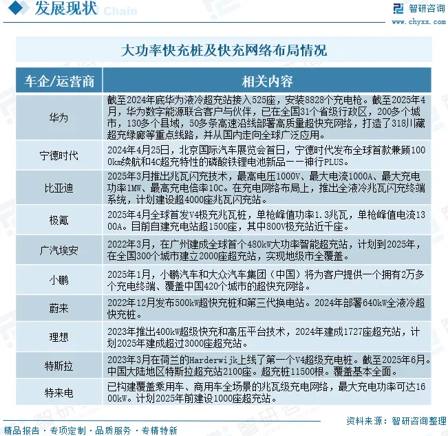 完善大功率充电基础设施网络建设是推动高压快充技术实现规模化应用的关键支撑。为匹配800V高压平台车型的规模化量产进程,新能源汽车领军企业、电池龙头企业及充电运营商正积极布局大功率直流充电网络。其中,华为、宁德时代、比亚迪、极氪等企业相继突破兆瓦级超充技术瓶颈,加速推进超快充网络建设。例如,2025年3月,比亚迪推出超级e平台3.0,发布兆瓦闪充技术,最大充电功率1MW、支持10C充电倍率;2025年4月,华为发布超充联盟2.0,发布全液冷兆瓦级超充解决方案,峰值功率达1.5兆瓦,最大充电电流2400A,可实现15分钟为300度电池包完成满电循环,补能效率较传统快充桩提升近4倍。