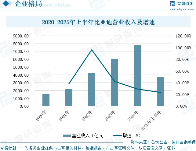 比亚迪股份有限公司主要从事以新能源汽车为主的汽车业务,手机部件及组装业务,二次充电电池及光伏业务,同时利用自身的技术优势拓展城市轨道交通业务领域。作为全球新能源汽车行业先行者和领导者,集团凭借在汽车电动化及智能化等关键领域的雄厚技术积累,通过技术的持续创新,打造出长期、可持续的核心竞争优势,夯实了集团于全球新能源汽车行业的领导地位,加速推动全球汽车产业转型升级进程。2025年3月,集团发布全球首个量产的乘用车全域千伏高压架构—“超级e平台”,核心三电全维升级,推出10C充电倍率“闪充电池”、全球首款量产3万转电机和全新一代车规级碳化硅功率芯片,引领全球纯电技术平台的发展趋势。同时,集团宣布将通过自建及合作的方式在中国各地建设兆瓦闪充站,补齐兆瓦充电生态的最后一环,解决纯电动汽车补能痛点。“闪充电池”在超高电压1000V和超大电流1000A的加持下,可以做到全球量产最大充电功率1兆瓦(1000kW),实现“1秒2公里”的峰值充电速度和“闪充5分钟,畅行400公里”的充电效果,让“人等车”变为“车等人”,为用户带来极致的充电体验,开启“油电同速”新时代。从企业经营情况来看,2025年上半年,比亚迪营业收入为3712.81亿元,同比增长23.3%。