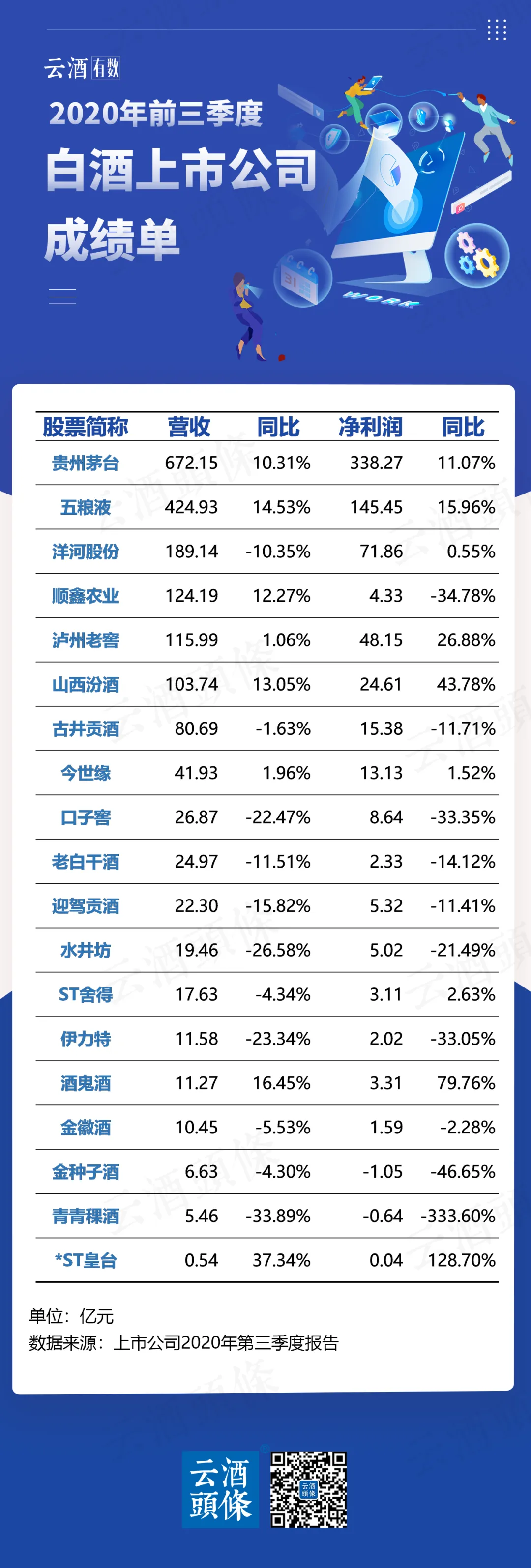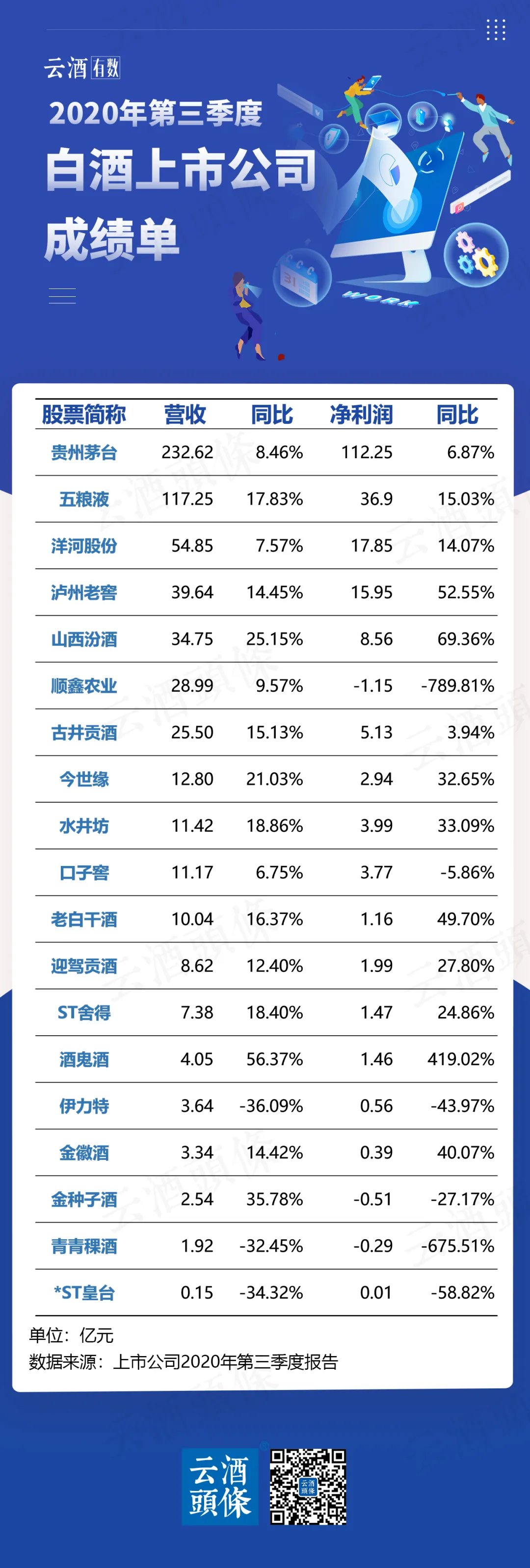 截至10月30日晚间,19家白酒上市公司2020年三季报发布完毕。