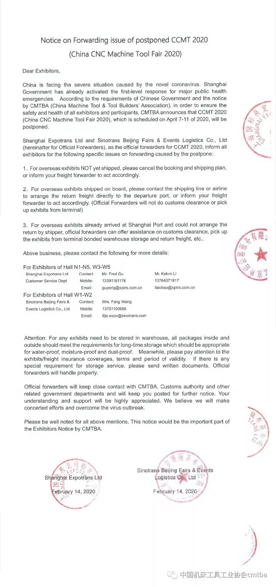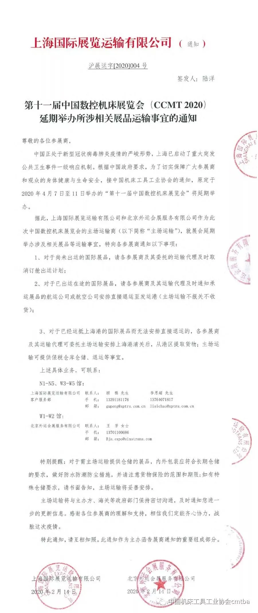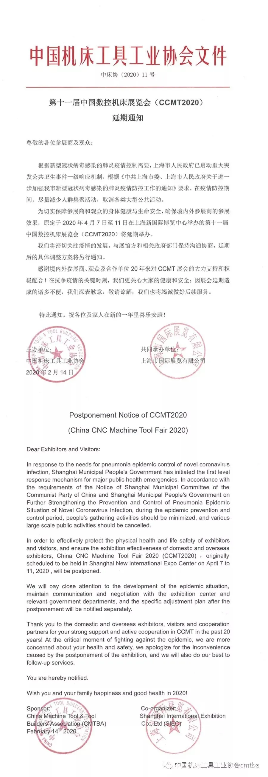 第十一届中国数控机床展览会(CCMT2020)延期通知