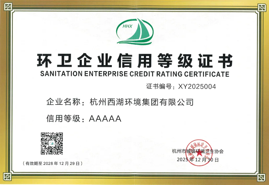 喜讯传来!西湖环境集团凭借卓越的综合实力、规范的管理体系、优质的服务品质及良好的行业口碑,成功获评环卫企业信用评级AAAAA等级!这一认定不仅是对集团深耕环卫领域多年的高度认可,更是对守护洁净、践行国企担当的有力见证。