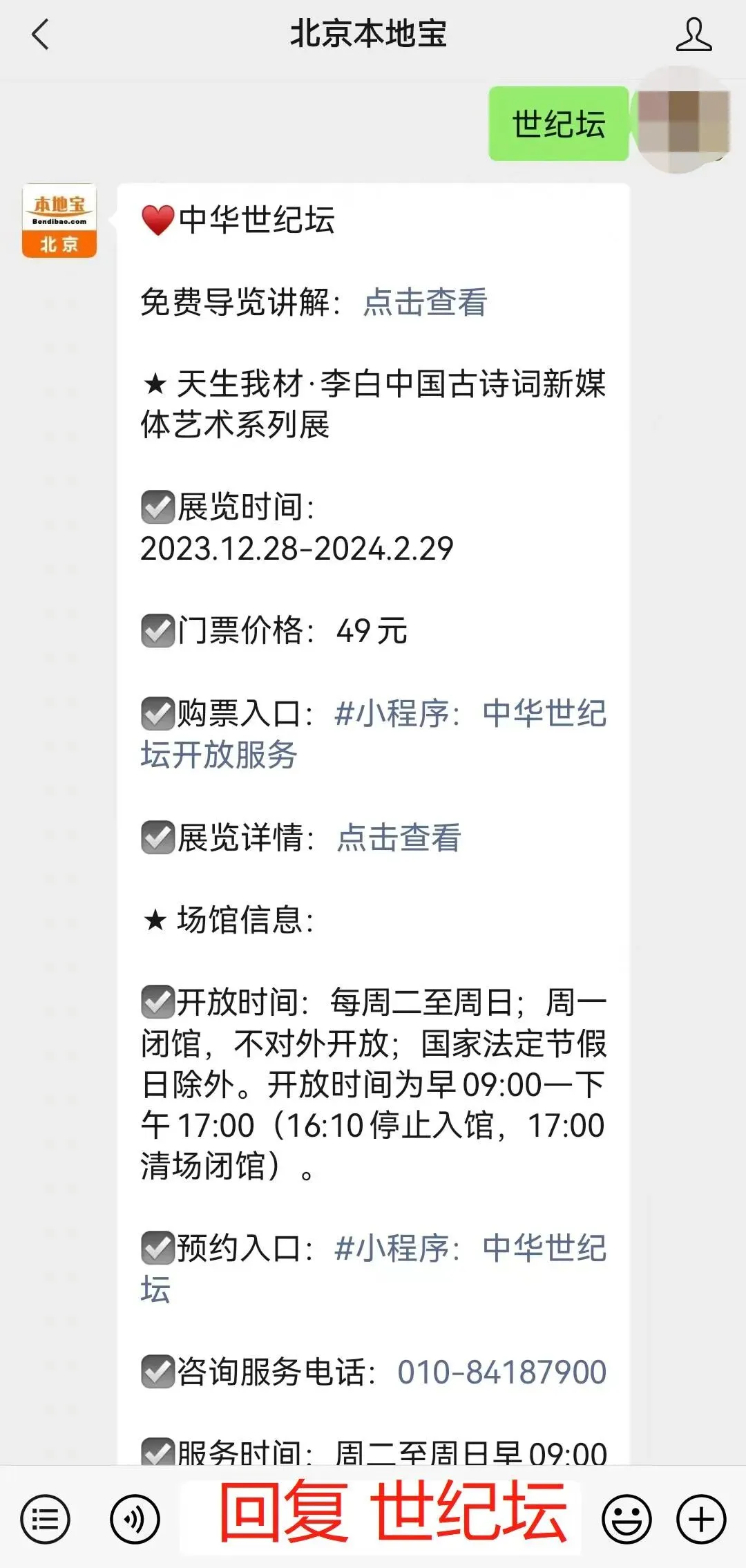 购票入口:点击下方公众号名片,关注【北京本地宝】微信公众号,在聊天对话框内回复【世纪坛】即可获取中华世纪坛展览购票入口、中华世纪坛预约入口