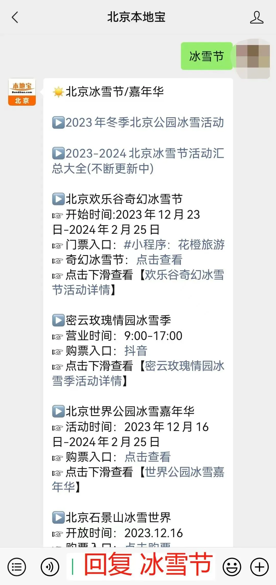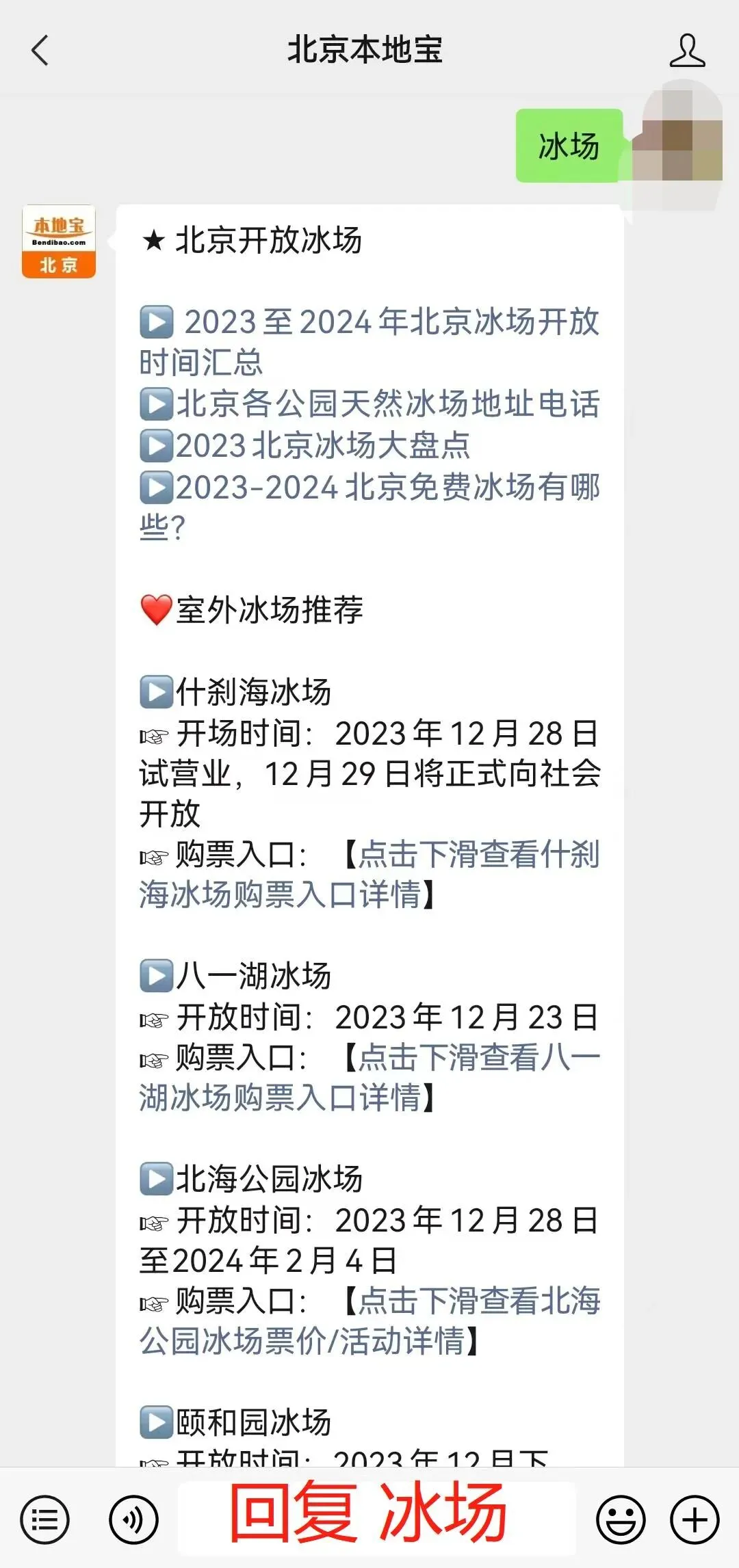 点击下方公众号名片,关注【北京本地宝】微信公众号,在聊天对话框内回复【冰雪节】即可获取北京各区冰雪嘉年华购票入口;继续回复【冰场】即可获取北京各大室外冰场购票入口