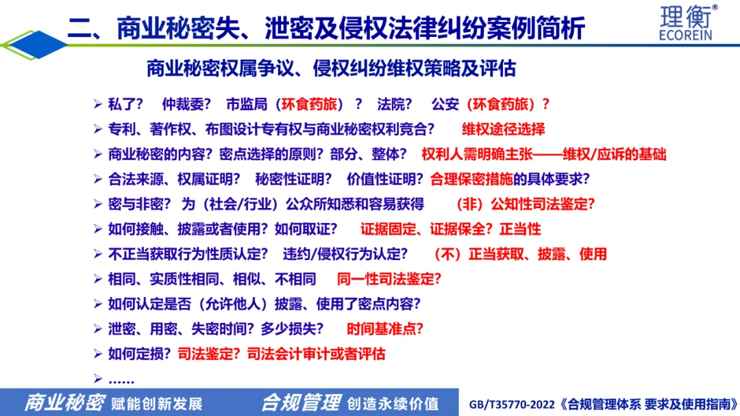 他强调,有效的商业秘密保护前提是清晰的识别与合理的保密措施。企业应系统识别技术信息与经营信息,确保符合“秘密性、价值性、保密性”法定要件,并在维权中善用法律规定的举证责任转移规则。