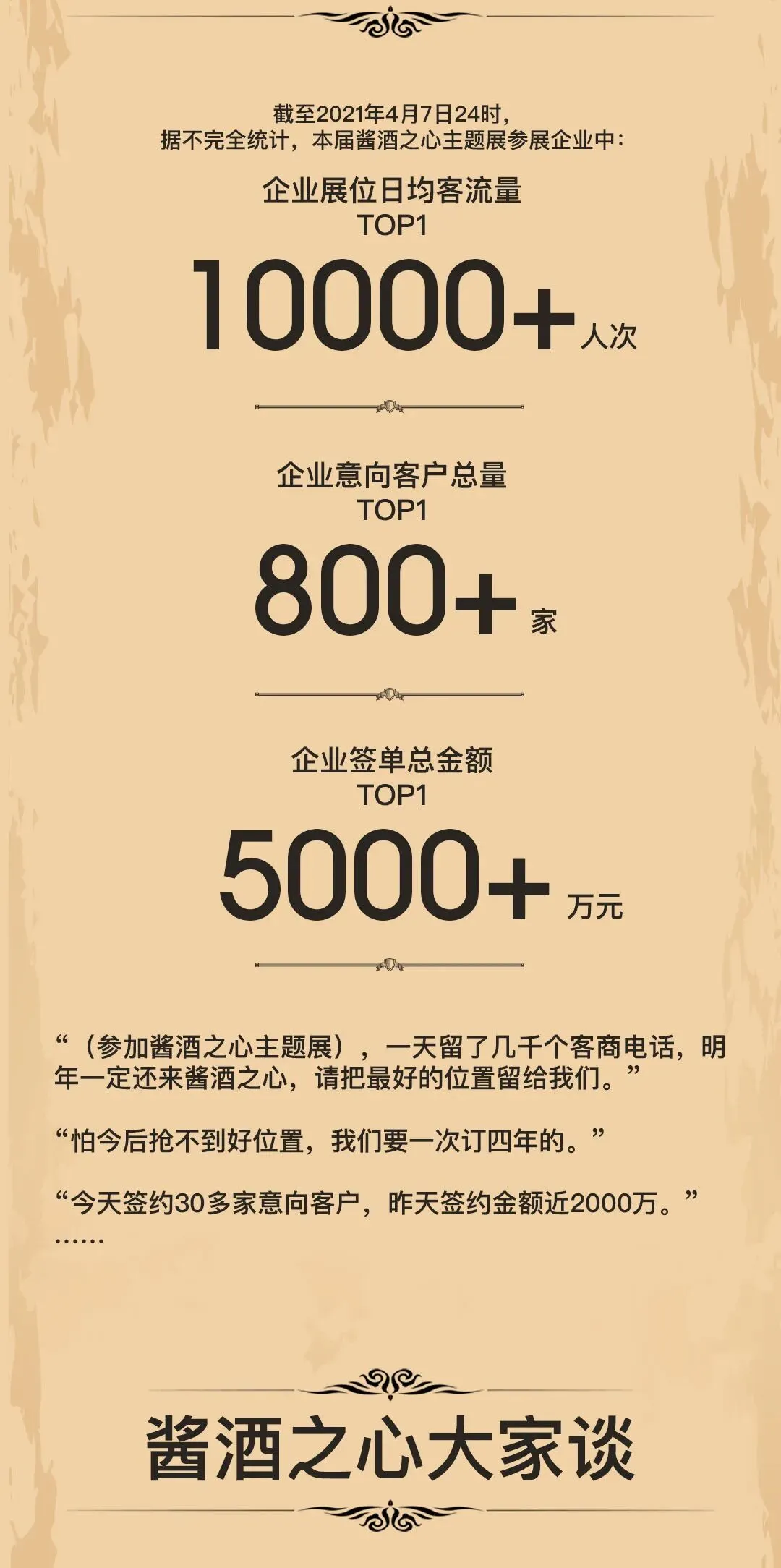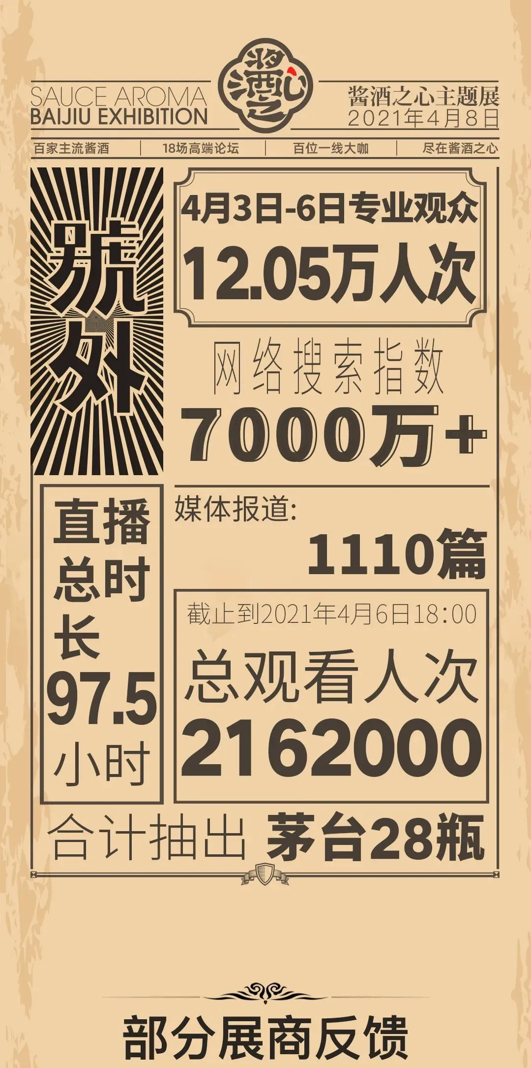 来自4月3日-6日的现场统计数据表明,本次酱酒之心主题展是一次成功的酒类主题大型会展活动,为酱酒厂商对接和贸易合作,搭建了高质量平台,为“酱酒热”又添上一把旺火。