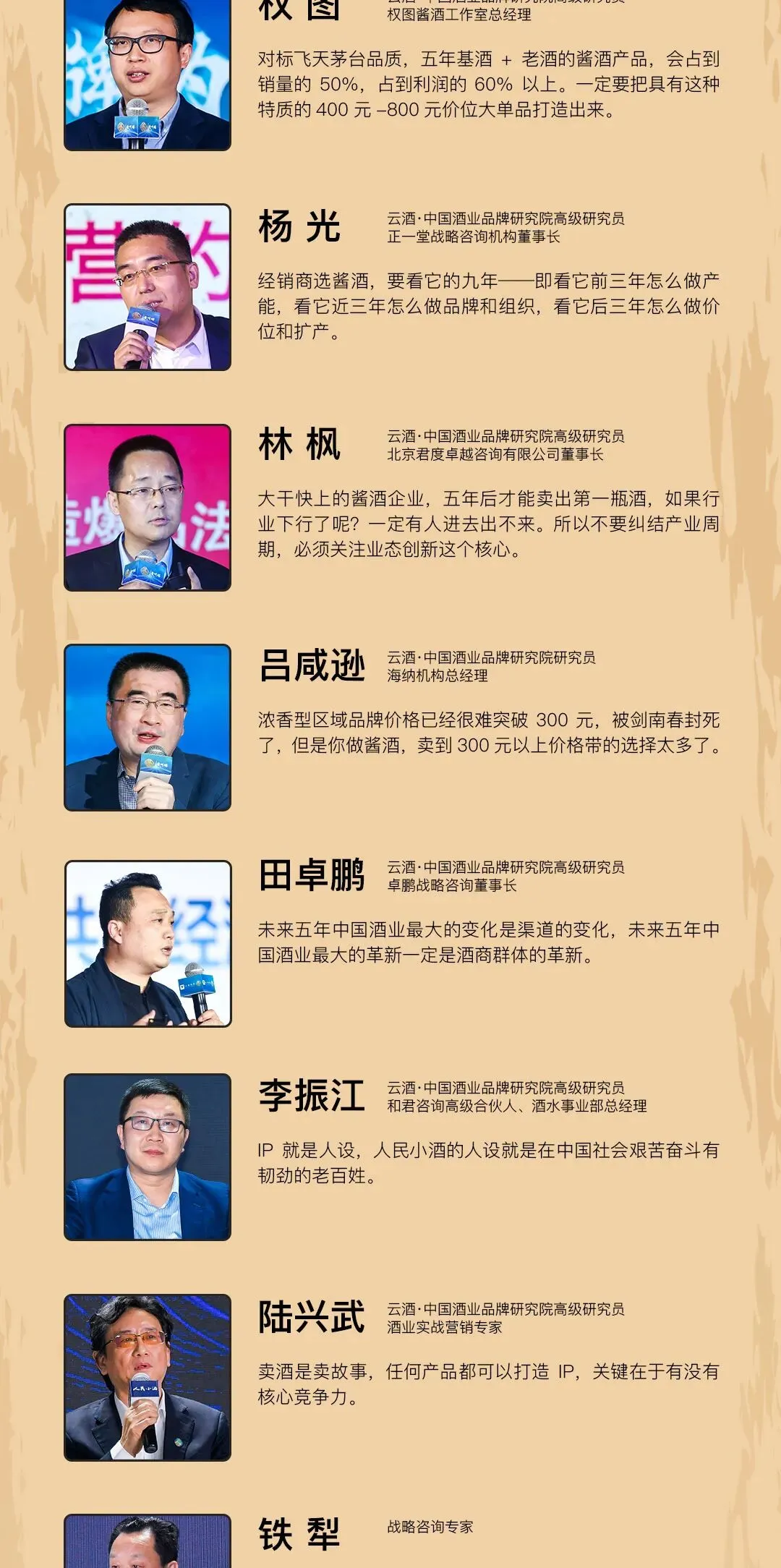 权图、杨光、林枫、吕咸逊、田卓鹏,这五个名字代表着酒类智业的顶流,背后是难以计数的酒类成功案例,在“酱酒之心”期间的“贵州醇2021酱酒五人组趋势发布会”上,五大头脑围绕酱酒后市趋势与路径,爆发了一场激烈“论战”(点击链接阅读原文)。