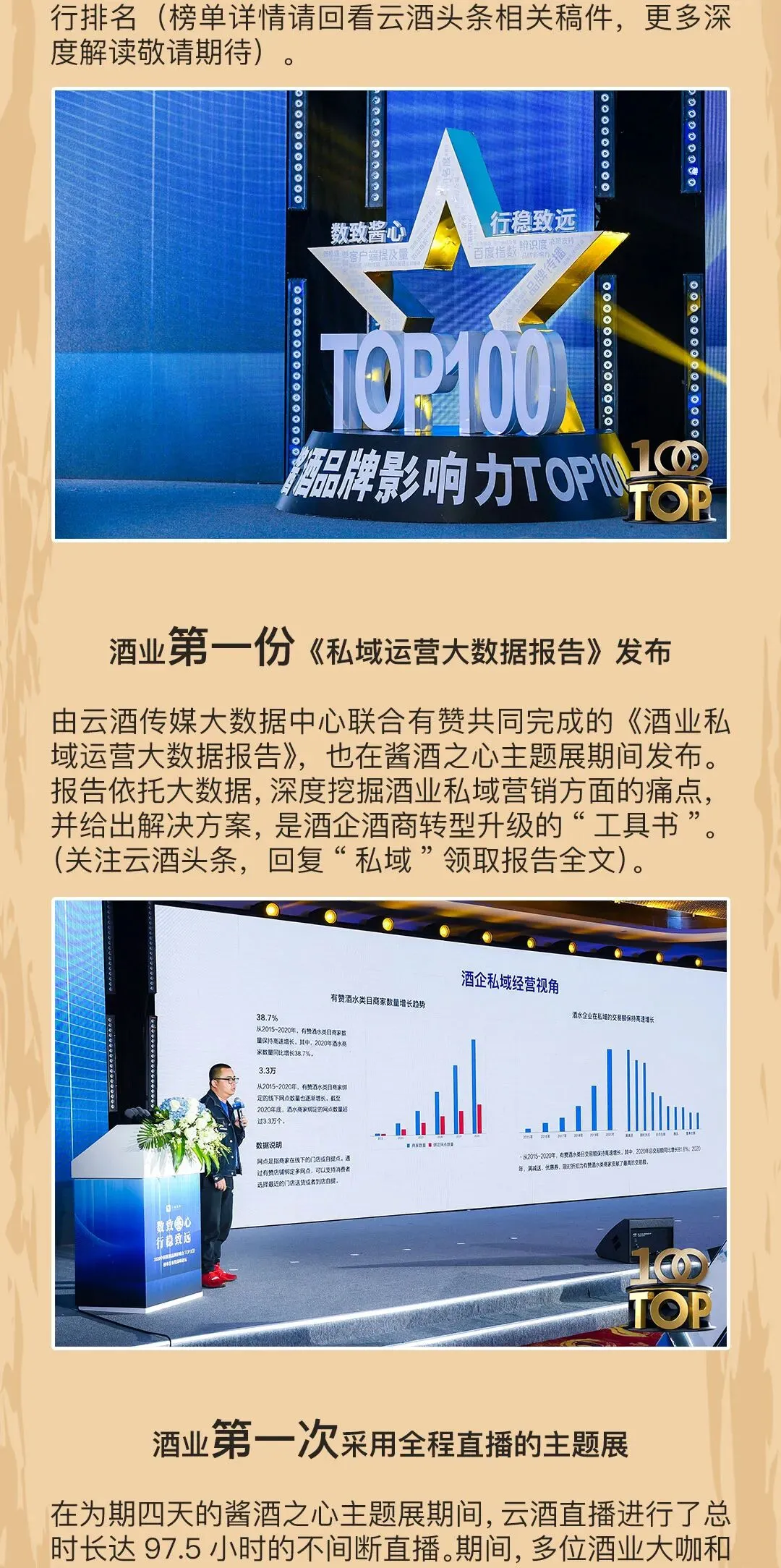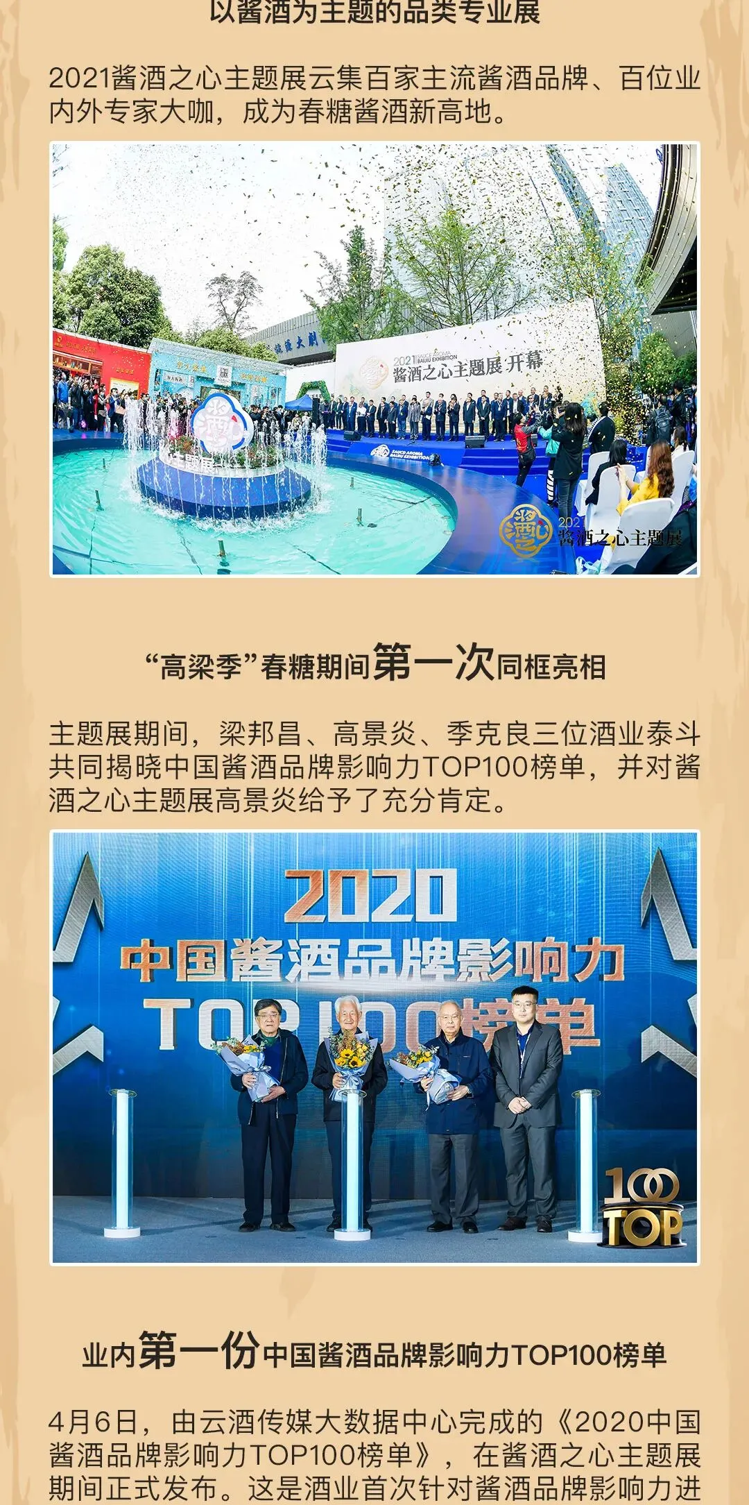 云酒传媒大数据中心在“酱酒之心”发布了《2020中国酱酒品牌影响力TOP100榜单》(点击链接阅读原文),这是行业首次以大数据支持,针对酱酒品牌影响力所制作的排名榜单,在“酱酒之心”定位与企业品牌间形成了直接而坚固的联系。