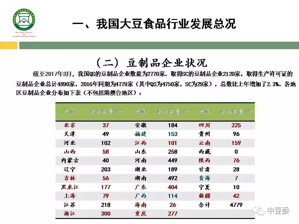 截至2017年3月,我国QS的豆制品企业数量为2770家,取得SC的豆制品企业2120家,取得生产许可证的豆制品企业总计4890家,2016年同期为4779家(其中QS为4750家,SC为29家),总数比上年增加了2.3%。各地区豆制品企业分布如下表(不包括港澳台地区):