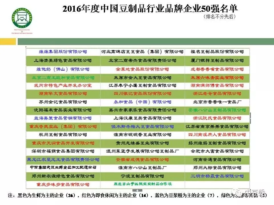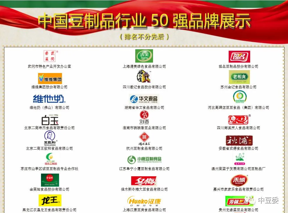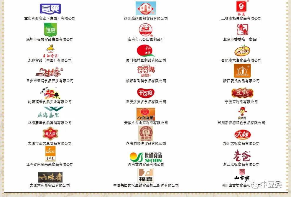 2016年度中国豆制品行业品牌企业50强名单(排名不分先后):