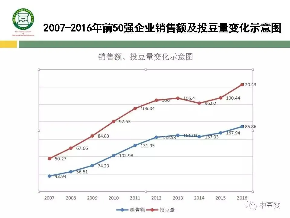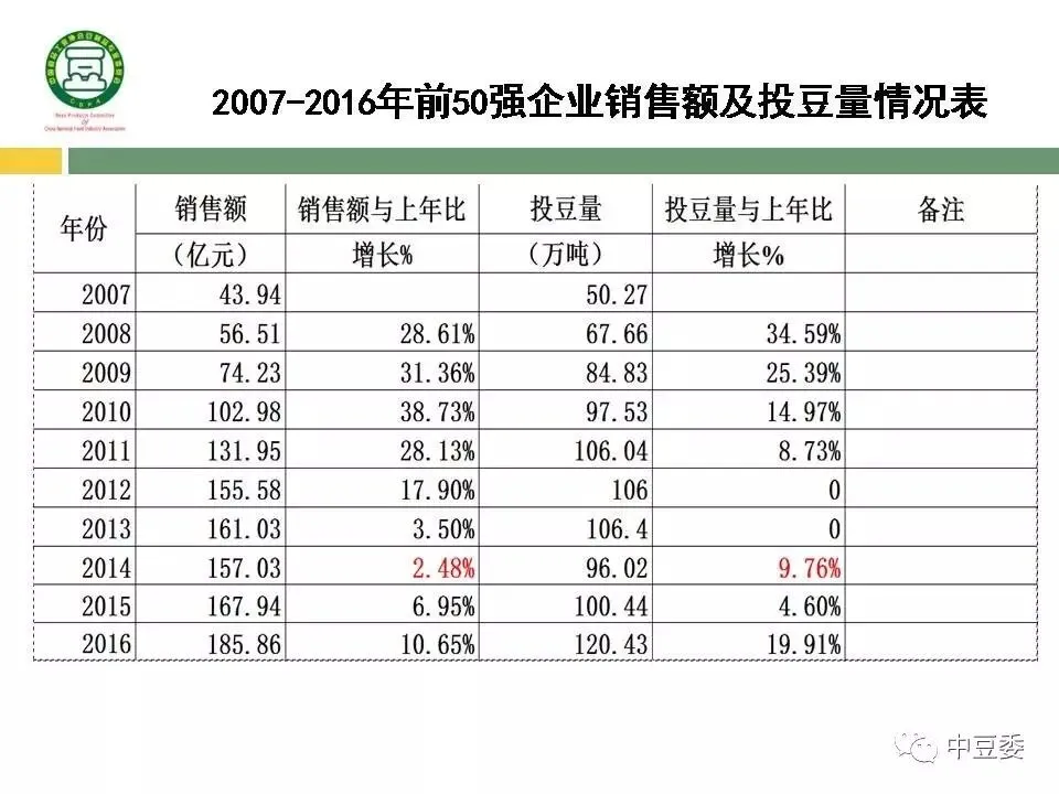 2007-2016年前50强企业销售额及投豆量情况表如下: