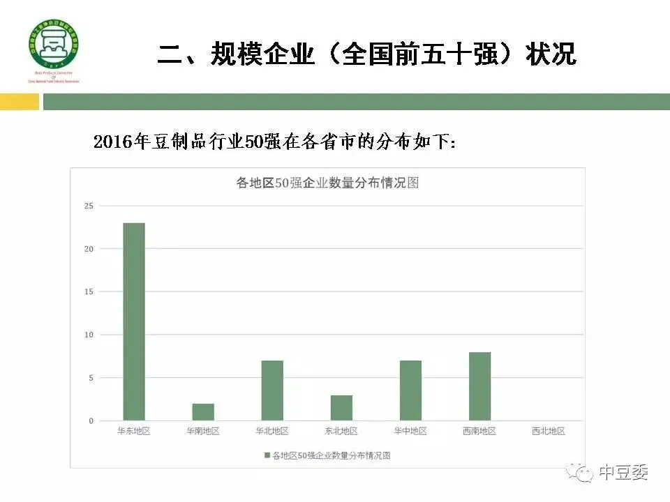 50强企业中,规模企业数量大部分相对集中在发达地区,西北地区豆制品企业还没有一家进入50强;