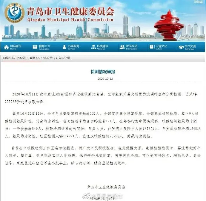 今天下午,青岛市卫生健康委员会发布检测情况通报称,2020年10月11日青岛市发现3例新冠肺炎无症状感染者后,立即组织开展大规模的流调排查和分类检测,已采样277968份进行核酸检测。