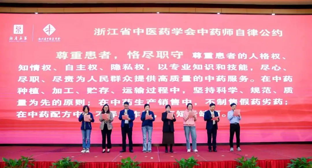 浙江省、市、县级医疗机构代表、社会办医、“浙产名药”企业代表等共同宣读《浙江省中医药学会中药师自律公约》