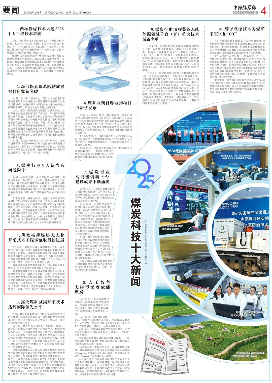 薄及极薄煤层无人化开采技术工程示范取得新进展