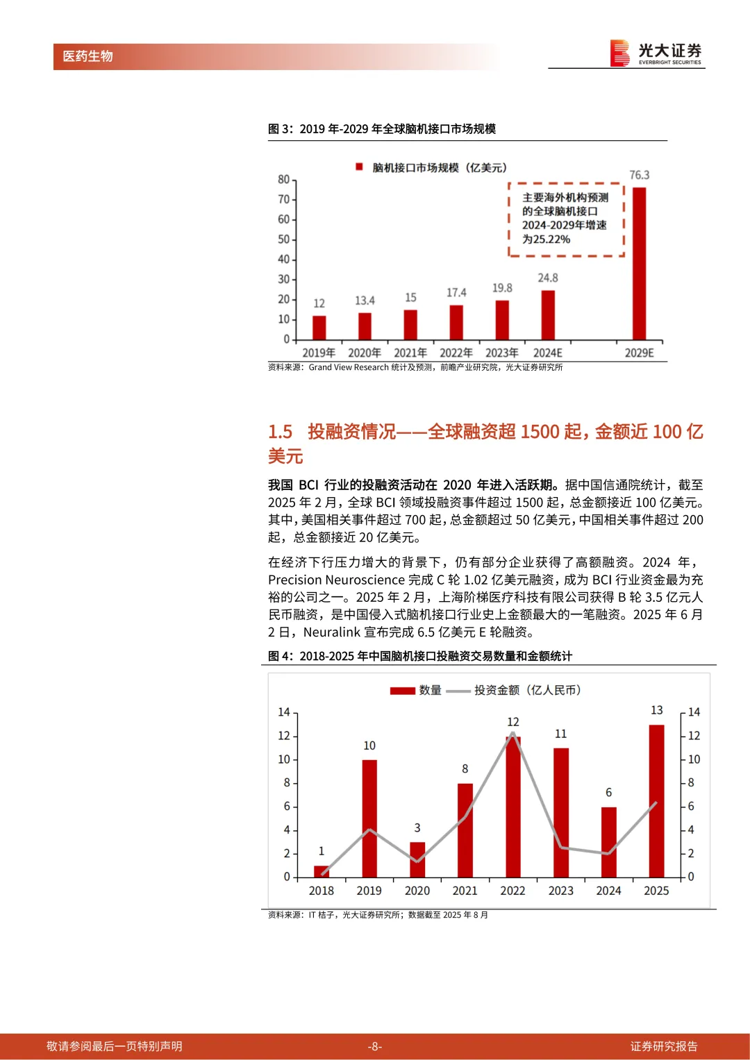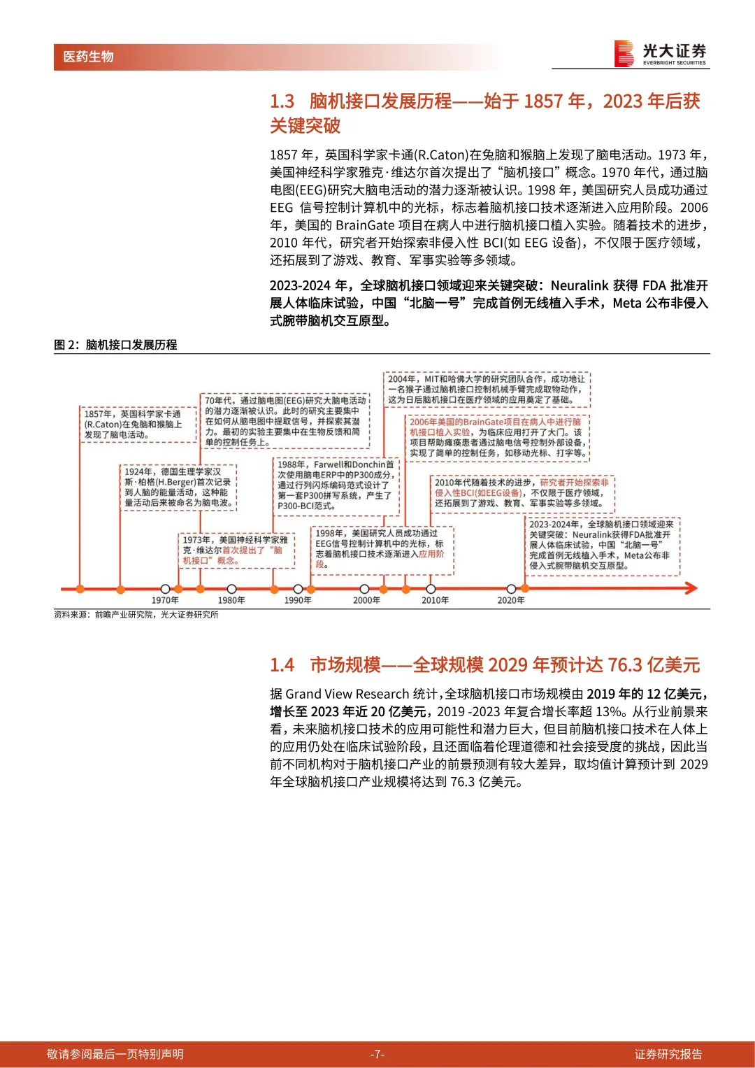 据 Grand View Research 统计,全球脑机接口市场规模由 2019 年的 12 亿美元,增长至 2023 年近 20 亿美元,2019 -2023 年复合增长率超 13%。从行业前景来看,未来脑机接口技术的应用可能性和潜力巨大,但目前脑机接口技术在人体上的应用仍处在临床试验阶段,且还面临着伦理道德和社会接受度的挑战,因此当前不同机构对于脑机接口产业的前景预测有较大差异,取均值计算预计到 2029年全球脑机接口产业规模将达到 76.3 亿美元。