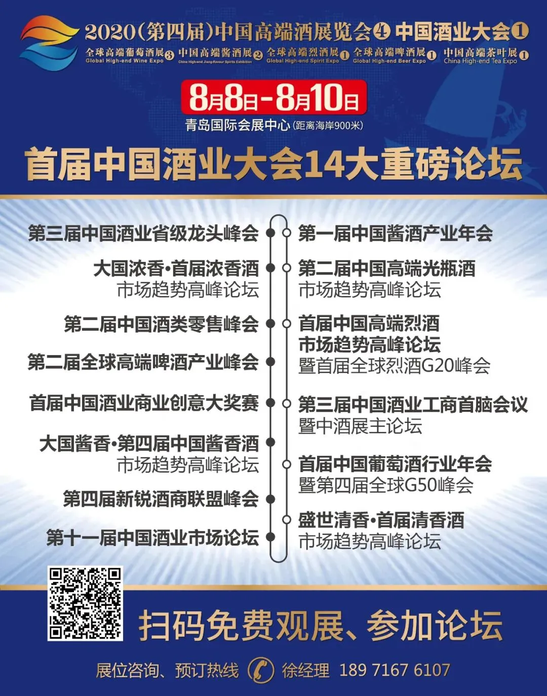 上半年去库存,下半年备货、选品备战双节旺季,与6万户专业酒商面对面,2020年度唯一一次黄金招商窗口期就在第四届中酒展,展位预定请联系徐经理:18971676107(微信同)