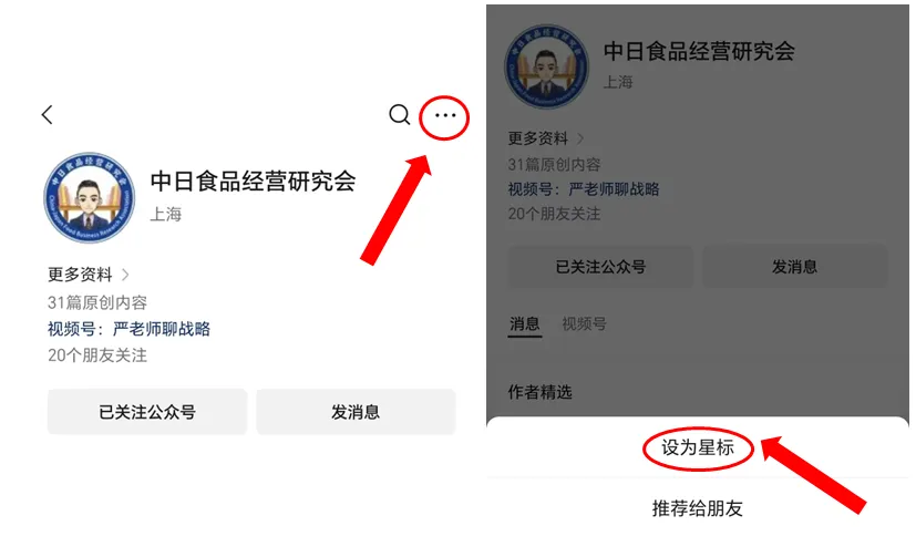 1.点击上方“中日食品经营研究会”进入公众号主页,点击右上角的“..."三个点。