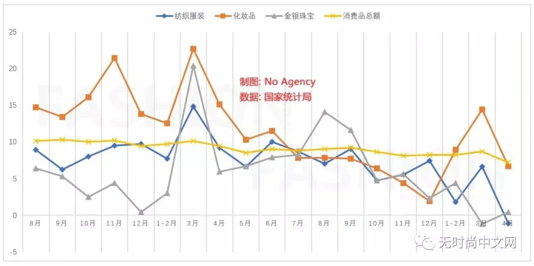 周三早上10点,国家统计局公布的数据显示,4月份中国服装业限上单位出现10年首次负增长,同比下滑1.1%,而零售业整体名义增速7.2%,创下2003年5月来的16年新低。撇除价格因素,4月零售业增速进一步低至5.1%,而2009年2月服装销售下滑主要因素还在于农历年因素,此前一个月2009年1月服装销售增速达34.1%,撇除农历年效应,服装销售增速同样创2003年5月3.5%负增长来16年新低,若撇除价格因素,该表现更是创下历史新低。
