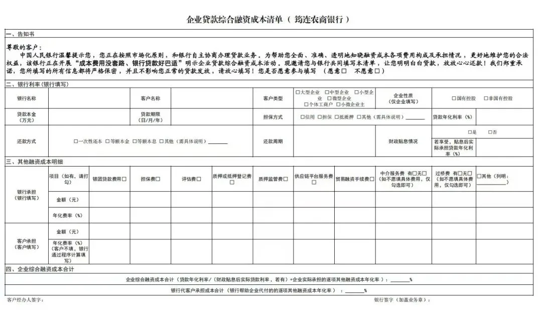 筠连农商银行将明示企业贷款综合融资成本作为服务实体经济、践行普惠金融的重要举措。通过建立健全内部工作机制,将成本告知环节深度嵌入贷款办理全流程。在业务受理阶段,客户经理即主动向企业出示《企业贷款综合融资成本告知书》,通过《成本清单》,逐项列明贷款利息、担保费、评估费、抵押登记费、保险费等全部费用构成。对于由银行承担的费用,同样予以明确标注,确保企业对自己“需要支付多少费用、银行代为承担哪些成本”一目了然。