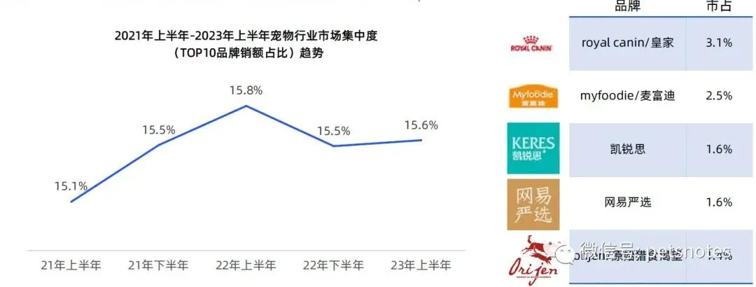 淘系平台宠物销售金额自2022年8月起一直保持同比正向增长,目前来看,市场集中度相对较低,头部品牌市占稳定,整体市场较为分散,2023年上半年前十名品牌的市场份额总和为整体市场的15.6%,其中皇家和麦富迪的市场占有率排名前列。