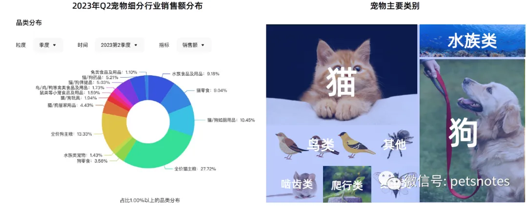 犬猫产品是线上销售主力,猫经济是宠物行业最大市场,值得注意的是,水族类产品也占据着重要类目,其销售占比为9.18%。