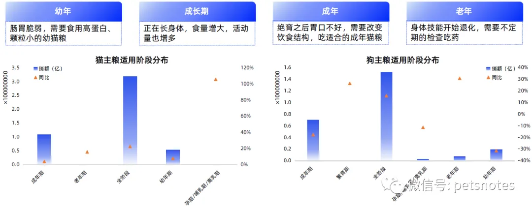科学化养宠逐步深入人心,细分聚焦各类场景与成长阶段,宠物食品正在满足不同年龄段宠物的细分化需求。猫主粮中孕期/哺乳期/离乳期阶段产品销额高速成长,狗主粮中繁育期、老年期是增量阶段。