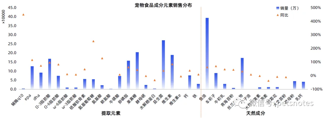 随着消费者对宠物食品的要求不断提升,原料成分成为重要关注点之一。其中各类天然的宠物食品原料受到广泛关注,鱼油、丝兰提取物、车前子销量在各成分中销量高且在持续成长。