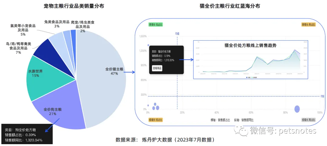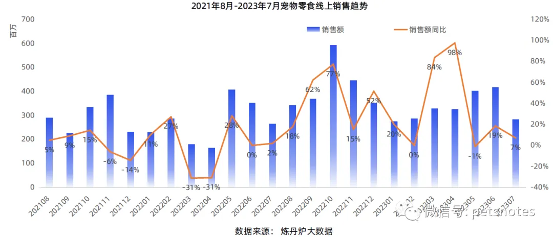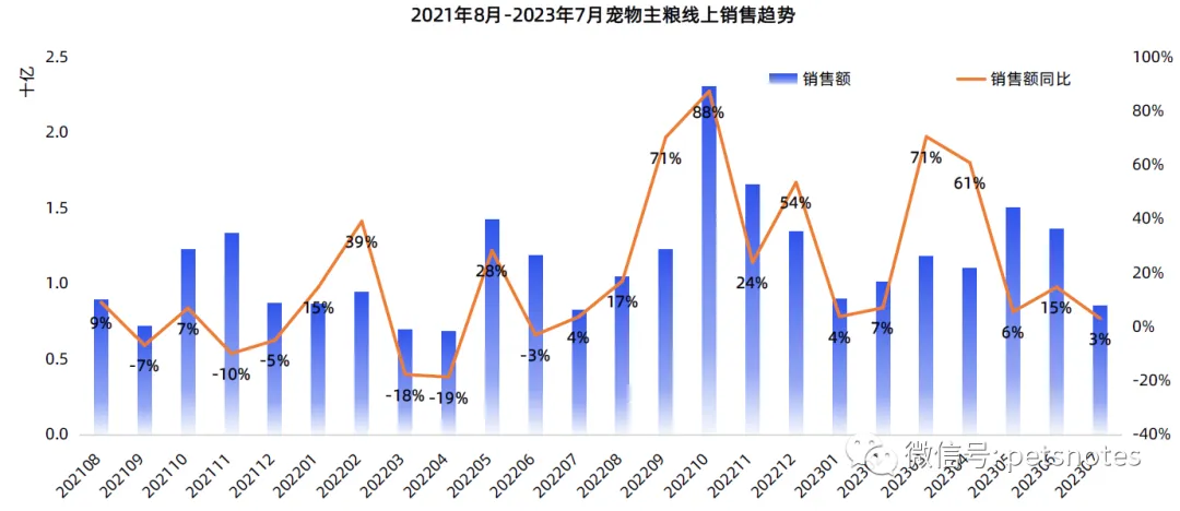 行业大盘:淘系宠物主粮7月份销售增速放缓,其主要原因在于2023年初至6月的销售提前放量,尤其是618期间的大促销售,对于消费者需求的释放起到了极大促进作用,进而导致7月份需求端的减少。