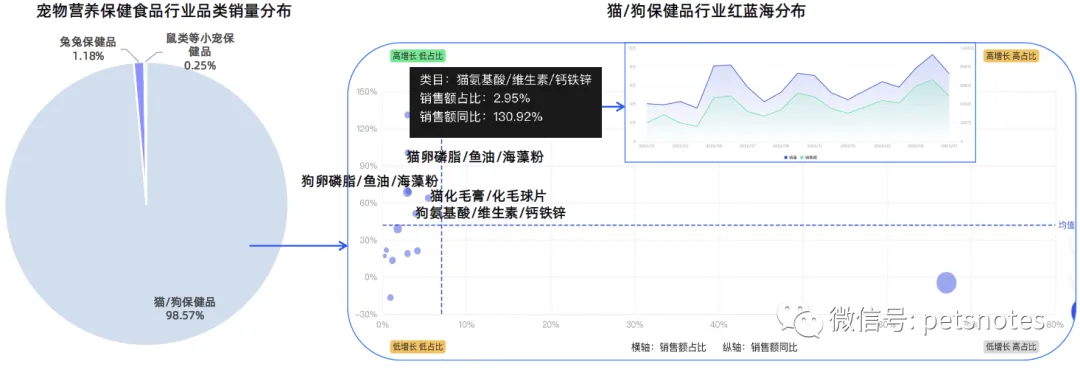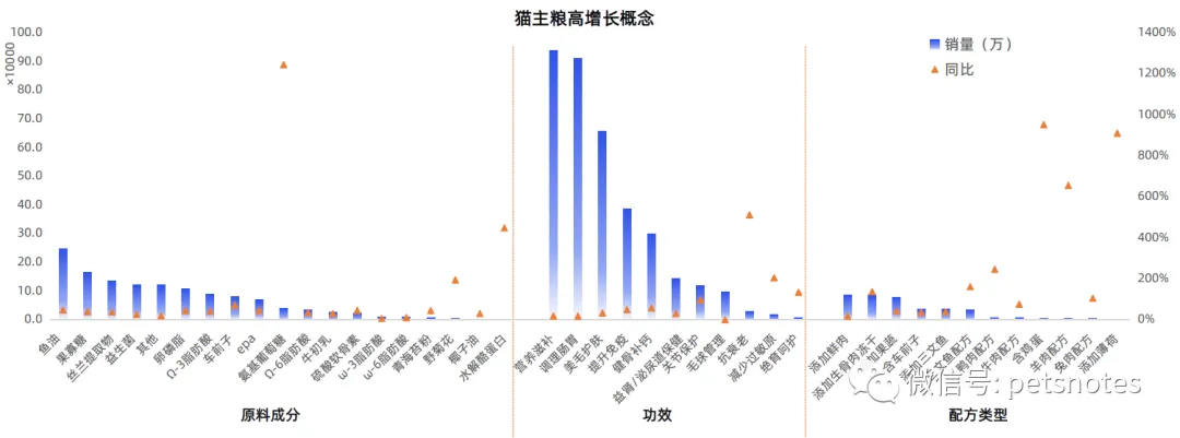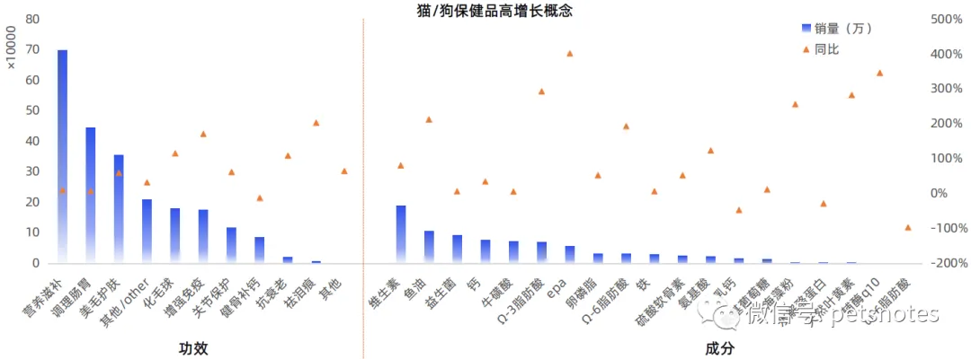 产品趋势:营养滋补、肠胃调理功效概念占据主导,去泪痕、增强免疫、化毛球是高增长概念;维生素、鱼油是主流营养保健成分,epa、辅酶q10、天然叶黄素等多种成分增长迅速,存在发展机会。