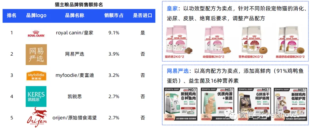 竞争情况:国产品牌替代化进行中,进口品牌占据猫主粮行业头部市场地位,各品牌主要以产品的优势功效、配方为卖点。