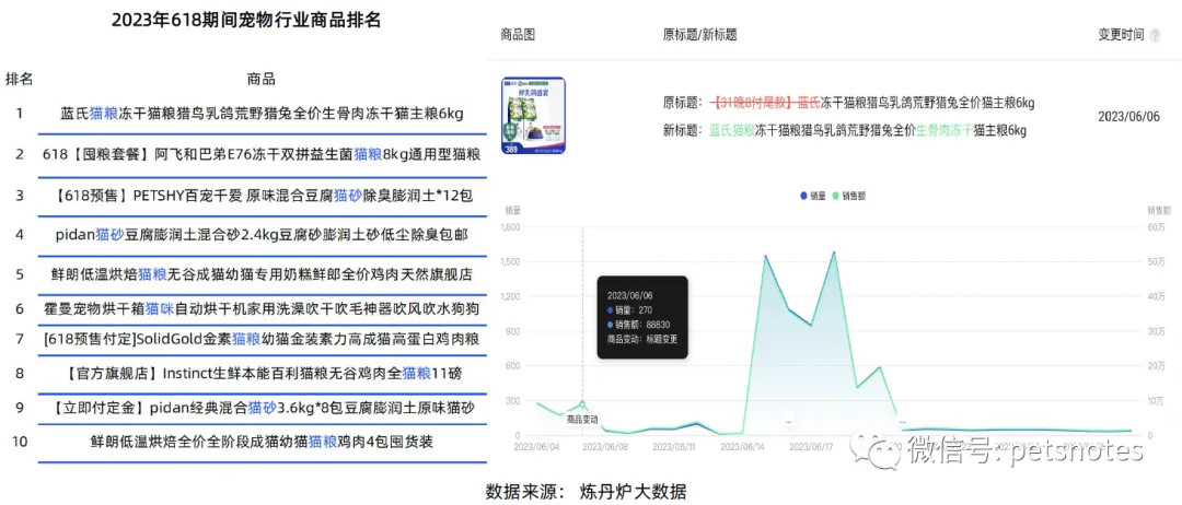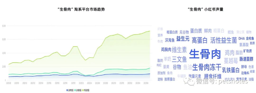 以蓝氏为例,其在618期间,宠物行业中销量排名第一,重点布局强调生骨肉概念。同时,在线上市场中,受到市场宣传催化,生骨肉概念在市场与消费者端均有上升趋势。