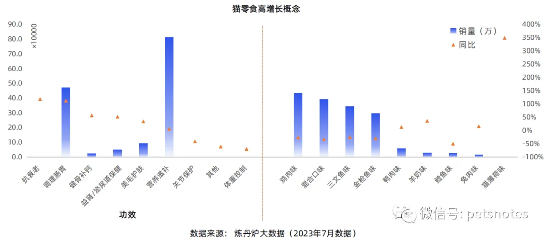 产品趋势:宠物零食作为休闲补充食品,注重营养与口味丰富度。营养滋补、肠胃调理功效概念占据主导,抗衰老是高增长概念;鸡肉、混合口味是最主流的口味类型,含猫薄荷的猫零食增速明显。