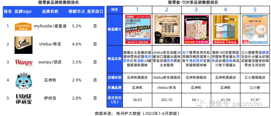 竞争情况:瓜洲牧品牌在猫零食中处于领先地位,在前五商品中占大头;增肥与营养功效概念占主导;罐头、猫条、冻干是主流的猫零食形式。