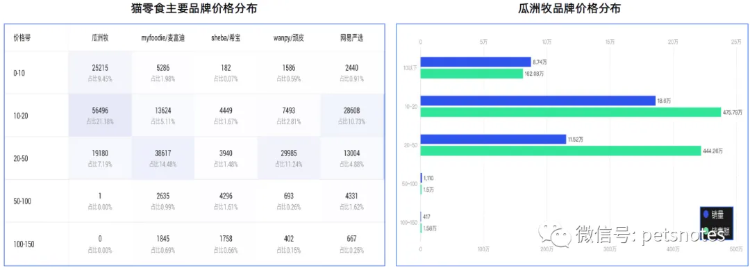 猫零食行业下,主要品牌的价格带集中在20-50元,而瓜洲牧主要走的是平价路线,在10-20价格段中销量与销额最高,整体产品价格也集中在50元以下。
