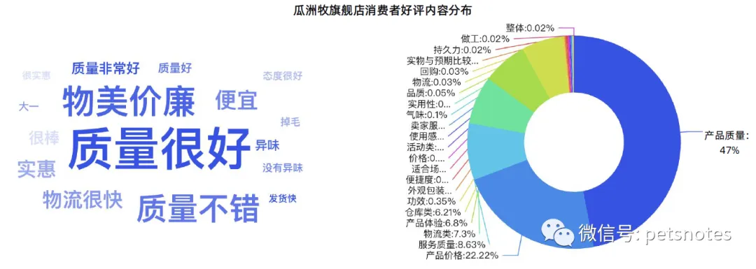 虽然瓜洲牧产品价格比较低,但是其产品品质并不低,以高性价比收获消费者追捧。在瓜洲牧旗舰店的消费者好评评价中,对产品质量、产品价格对评价占47%与22%。