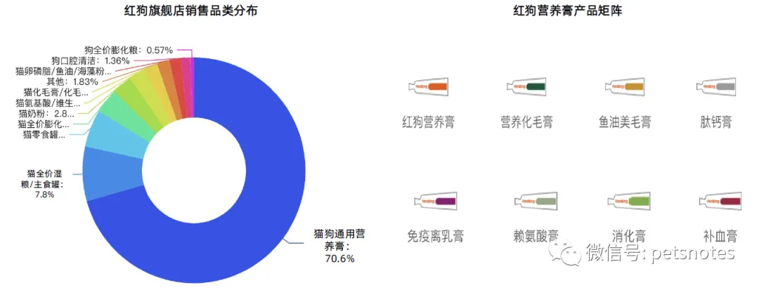 目前宠物营养膏是红狗品牌的主营产品,红狗旗舰店中猫狗营养膏占比70.6%,各类功能营养膏产品矩阵丰富。