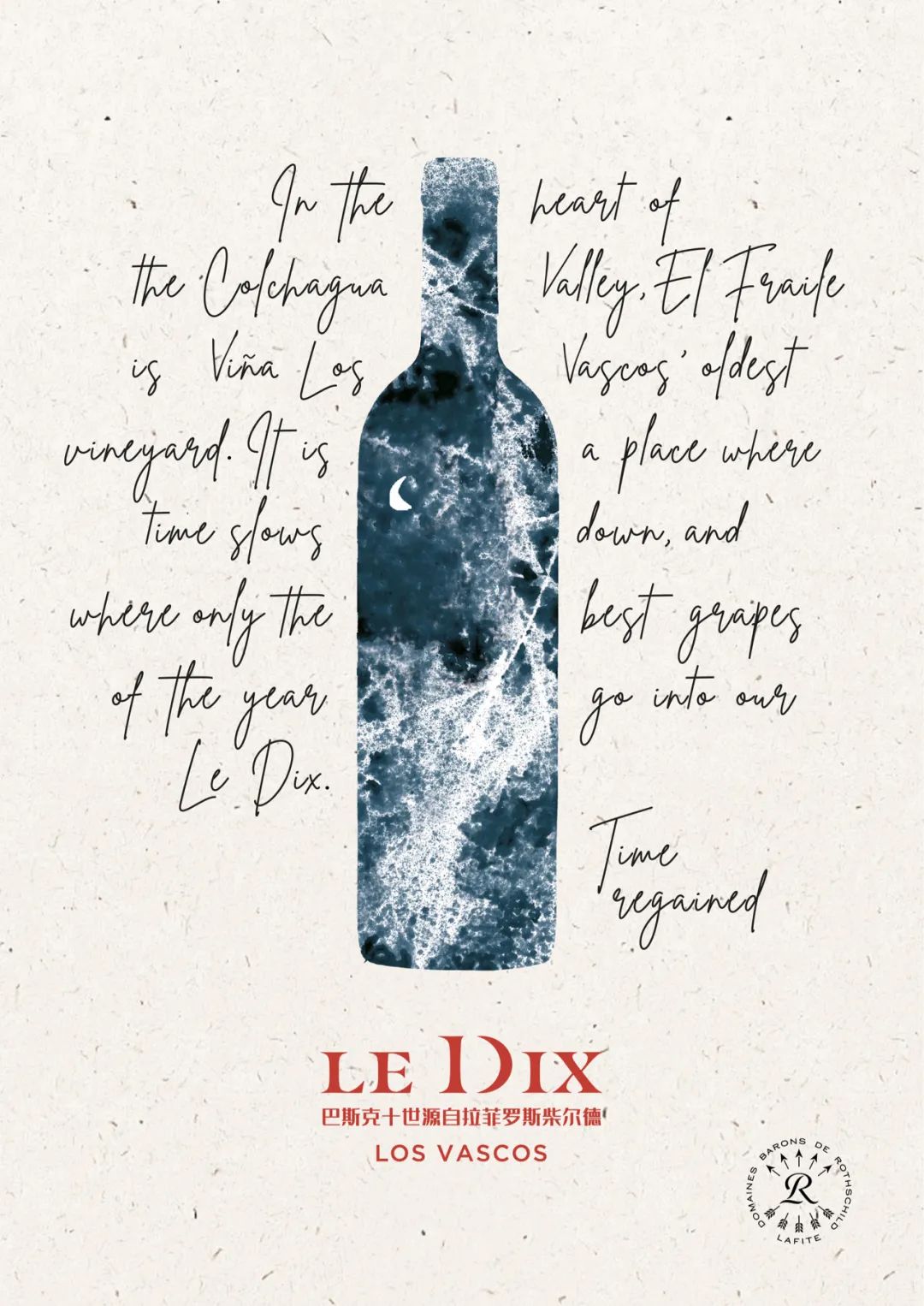 随着5个年份的巴斯克十世的逐一品鉴,嘉宾们不仅能感受到从新年份到老年份不同口感的层次变化,更对巴斯克酒庄有更深刻的认识。目前,智利是中国进口葡萄酒第二大来源国,不仅进口量逐渐递增,其高品质在近年也逐渐被中国消费者所认可。智利特殊的地形以及得天独厚的地理位置,造就了智利葡萄酒的多样性以及独特性。发展至今,越来越多的消费者了解到智利葡萄酒的优秀品质以及多样的可能性。据智利葡萄酒协会统计,2022年智利瓶装葡萄酒对华出口额占出口总额的15%左右。即便在2022年,中国对葡萄酒的需求有所下跌,但按照出口额计算,中国仍然是智利葡萄酒最大出口目的国,这也说明智利精品葡萄酒的主要市场仍然是在中国。在这样的“风口”下,品牌与产品力的比拼相当关键,巴斯克酒庄作为拉菲罗斯柴尔德男爵酒业公司首个跨出法国后收购的智利精品酒庄,无论是风土还是酿酒技艺,已经是能够酿造出精品佳酿的保证。据悉,拉菲罗斯柴尔德男爵酒业公司国际销售总监-纪尧姆·德格里斯(Guillaume Deglise)先生、拉菲罗斯柴尔德男爵酒业公司中国区总经理-宋萍(Anna Song)女士与丰联精品酒业总经理-张松新先生将会齐聚现场,一齐带大家领略巴斯克十世作为智利产区代表的优秀品质,进而感受拉菲罗斯柴尔德男爵酒业公司从风土选择、酿造技艺和制定产品理念等各环节展现出的综合实力。纪尧姆·德格里斯(Guillaume Deglise)而在此次的巴斯克十世垂直年份品鉴大师班后, 拉菲罗斯柴尔德男爵酒业公司还将举办“DBR Lafite,meet the family拉菲罗斯柴尔德男爵酒业,与家相遇”晚宴。纪尧姆·德格里斯先生此次特地从法国亲临活动,与大家分享更多自己对目前产业发展的洞察,以及对未来广阔前景的预见和期盼,足以表现出拉菲罗斯柴尔德男爵酒业公司对于中国市场的高度重视,更显示出正在蓬勃发展中的中国葡萄酒市场在拉菲罗斯柴尔德男爵酒业公司全球战略中所占据的举足轻重的地位。早在18世纪时,来自西班牙巴斯克地区的人们便开始在智利北部种植葡萄,直到1988年,这片充满潜力的土地被拉菲罗斯柴尔德男爵酒业公司发掘,巴斯克酒庄顺理成章地被公司收购。在购入后,拉菲罗斯柴尔德男爵酒业公司更使其焕发光彩,创酿出一系列能够体现当地风土和精湛酿造技艺的精品美酒。作为酒庄的旗舰酒款,巴斯克十世是酒庄“十年磨一剑”的结晶。为了纪念拉菲罗斯柴尔德男爵酒业公司的酿酒团队于此悉心开垦耕耘了十年,方得一款「十世」的高品质佳酿,在产品问世之初,便被赋予了“DIX”的名字,在法语中意为“十”,以此来纪念它的来之不易。巴斯克十世作为巴斯克酒庄的标志性酒款,其主要酿酒葡萄酒之一-赤霞珠精挑细选自历史悠久的地块。据了解,酿造「十世」佳酿的赤霞珠,来自巴斯克酒庄中一片名为“EL FRAILE”(僧侣)的优质老藤地块。这块田上葡萄树的种植密度高,能够出品拥有出色浓郁度的葡萄。不仅如此,“僧侣”的土壤相当深厚,拥有排水性佳的砂质和粉砂质土壤,使其成为一个优质平衡的葡萄园。该系列酒款于酒窖中经历陈年,到达理想饮用期时,才会被投入市场,这也体现了拉菲罗斯柴尔德男爵酒业公司对于葡萄酒品质精益求精的追求。巴斯克十世于2022年在产品形象和酒标上进行了全新而深刻的品牌诠释,让人耳目一新。在酒标的图案中,我们似乎看到了一个有关大地与天空的故事。云朵栖息于此,月亮依偎在深邃皎洁的夜空,吟唱着生命循环的自然韵律。葡萄树的根系与大地互相缠绵并汲取养分,枝叶在空气中呼吸并与日月星辰和浩瀚宇宙相连,并将其吸收的每一年精髓注入到巴斯克十世中。又因当地巨大的昼夜温差,有时能够超过30度,这一条件可以使巴斯克酒庄的葡萄果实稳步成熟,形成更为繁复的香气特征,同时还能够保持优秀的清爽度,为巴斯克十世的独特风味打下良好的基础。巴斯克十世以“复得的时光”作为理念,代表了酒庄各个优质年份精心耕耘下的精华,也屡次获得高分评价。巴斯克十世可谓是一款揭示时间的佳酿,在每一个年份的巴斯克十世美酒之中,都反映了当年酒庄风土、老藤以及四季轮换的一点一滴。同时,巴斯克十世是一款可以陈年,亦可在酒龄尚浅时享用的葡萄酒。它的每个年份都表达了葡萄采收在某个特定时刻的一个“快照”,都给人以复得巴斯克酒庄时光之感,获得重新体会在葡萄采收和此时品味美酒之间的时光精髓的机会。本次巴斯克十世垂直年份品鉴大师班,由拉菲罗斯柴尔德男爵酒业公司与丰联精品酒业联袂呈现,显现出双方对战略合作伙伴齐头并进的信心。