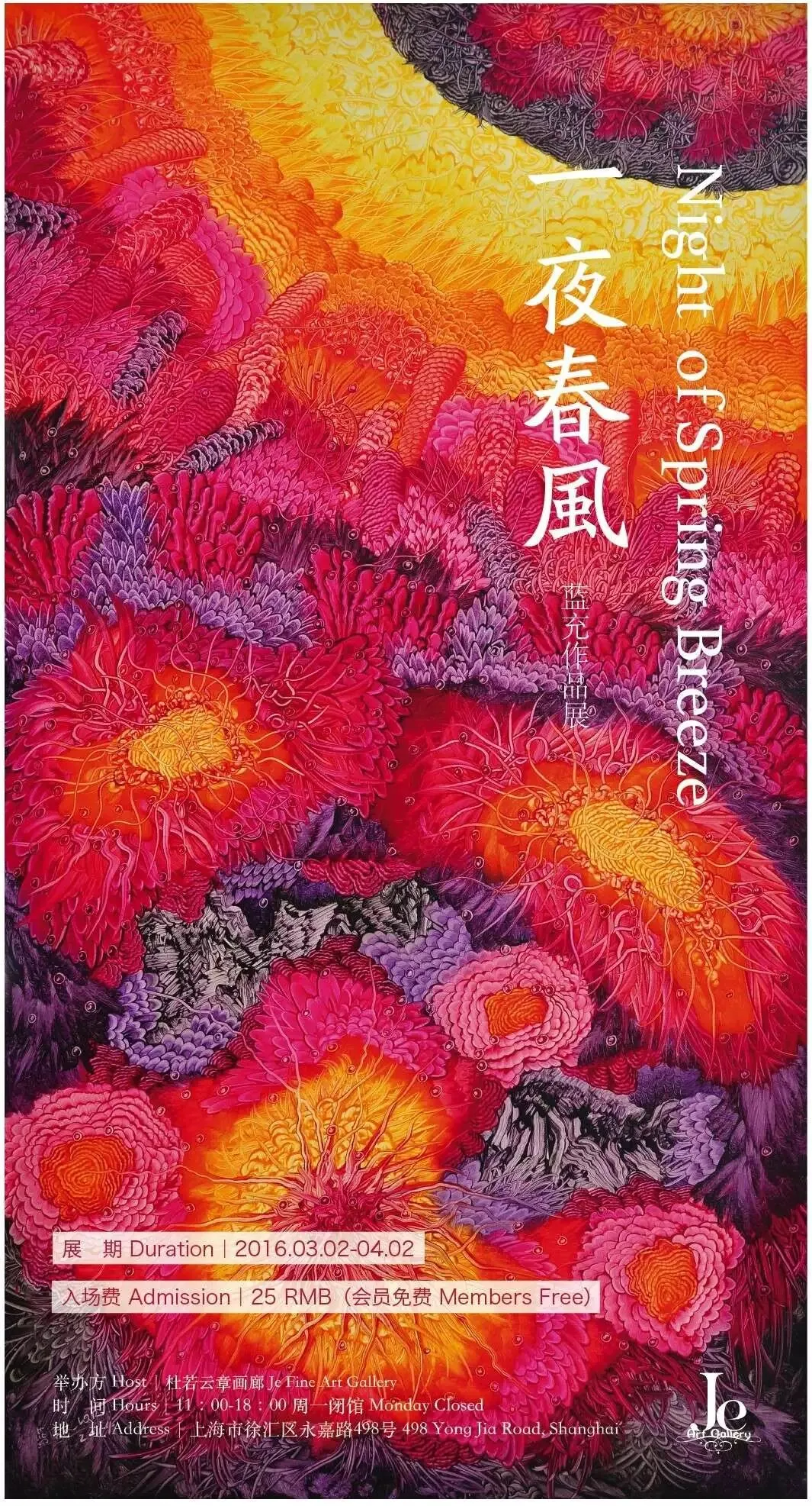 一夜春风蓝充作品展由《涅槃》、《花花世界》及《秘密花园》系列作品中挑选其中最具代表性作品20幅。 蓝充以炫丽的色彩和夸张的笔触,展现“生命力与其生命力投射着的生存状态”为创作风格与特点。个体与文化的对抗与融合产生出的火花有高亢响亮,也有隐晦压抑。