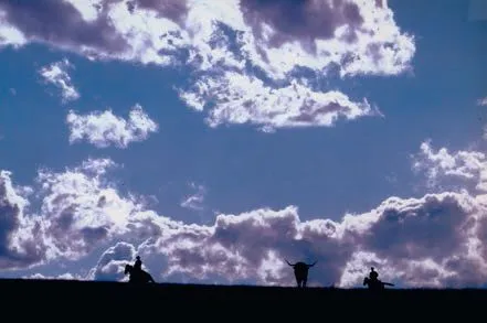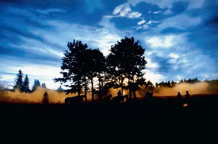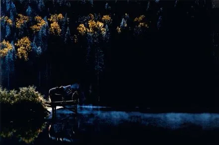▲在这四张照片中,马背上的男子形象融入苍茫自然,陷入黑暗,显得痛苦和神秘。牛仔们与野外融合在一起:他们或在深蓝广袤的天空下结队狩猎,或孤独地隐退于森林边际。