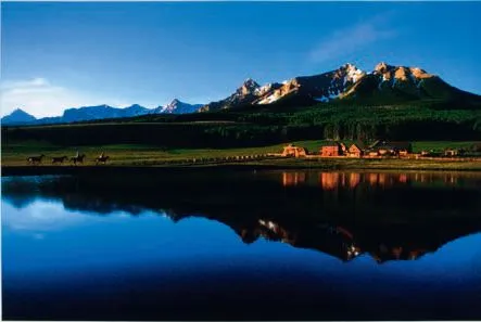 ▲第二张照片拍摄于一个巨大湖泊的边缘,湖水倒映着深蓝色天空、正在前往牧场的男人们和他们的马。