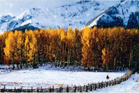 ▲第三张照片以雪为背景。白雪皑皑,四野茫茫,马背上的牛仔奔驰着跨越屏障,身后是一片泛黄的冬日树林。这一系列如田园风景画的照片,通过不同季节的景色呈现出电影般的回忆,不无讽刺地道出绘画中宏大的浪漫主义传统。